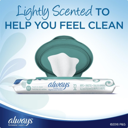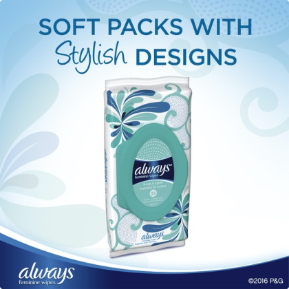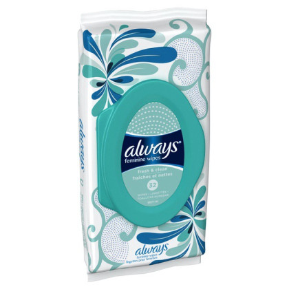 About This Item We aim to show you accurate product information. Manufacturers, suppliers and others provide what you see here, and we have not verified it. See our disclaimer Get that just-showered-clean feeling wherever you are. Always Feminine Wipes are perfect for quick cleansing during your period, after long activity, or any time you just want to feel fresh. These feminine wipes are lightly scented to help you feel clean and fresh throughout the day. Available in soft packs or individually wrapped. Always Feminine Wipes, Spring Blossom, Soft Pack, 32 Count: These powerful feminine wipes are lightly scented to help keep you feeling clean and fresh throughout the day Convenient, resealable lid Perfect for quick cleansing during your period, after long activity, or any time you want to feel fresh Spring Blossom Always cleansing cloths have a refreshingly soft, floral scent Available in stylish soft packs of 32 wipes with fun, fierce designs