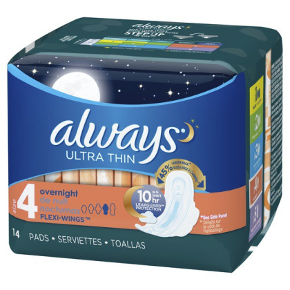 About This Item We aim to show you accurate product information. Manufacturers, suppliers and others provide what you see here, and we have not verified it. See our disclaimer Are you getting the right protection from your pad? Did you know that 60% of women are wearing the wrong size pad? Using the wrong pad size can lead to leaks. Step up in size to help stop leaks. Now you can find your fit with ALWAYS My Fit, a tailored sizing system to help you find the best protection based on both your flow AND panty size. Use the sizing chart in the images to find your fit for day and night. For overnight protection, ALWAYS Ultra Thin, Size 4, Overnight Pads With Flexi-Wings have a 45% larger back to help stop leaks at night*, plus a LeakGuard Core that absorbs in seconds and gives you up to 10 hours of protection with a fresh scent. *Vs. ALWAYS Ultra Thin Regular With Flexi-Wings ALWAYS Ultra Thin Size 4 Overnight Pads With Wings Unscented, 38 Count: Did you know that 60% of women are wearing the wrong size pad? This can lead to leaks. Step up in size to help stop leaks ALWAYS My Fit helps you get the best protection by tailoring your pad to fit your flow AND panty size. Use the sizing chart in the images to find your fit LeakGuard Core absorbs in seconds for up to 10 hours of protection Provides 45% larger back to help stop leaks at night* (*Vs. ALWAYS Ultra Thin Regular With Wings) ALWAYS Ultra Thin, Size 4, Overnight Pads With Wings have a flexible design for ALWAYS' best nighttime protection ALWAYS gives puberty education and pads to millions of girls around the world to help them stay confident