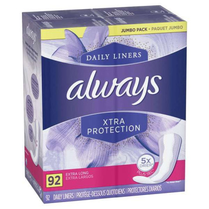 About This Item We aim to show you accurate product information. Manufacturers, suppliers and others provide what you see here, and we have not verified it. See our disclaimer For Xtra Protection every day of the month, Always Xtra Protection Daily Extra Long Liners have our best absorbing protection to keep you 5X drier*. Always Xtra Protection Daily Liners help you feel clean and comfortable thanks to an extra-absorbent LeakGuard Core + RapidDry. And Edge-2-Edge Adhesive to help keep the liner in place for stay-put protection. For feminine protection you can trust every day of the month, try Always Xtra Protection Daily Liners for women. *Vs. Always Sheer. Always Xtra Protection Daily Liners, Extra Long, 68 Count: Our best absorbing liners protect with LeakGuard Core + RapidDry to help keep you 5X drier (vs. Always Sheer) For a shower-fresh feeling all day, every day Absorbs leaks and odors in seconds Edge-2-Edge Adhesive helps keep the liner in place Always liners has products that help you get the level of protection that's right for you