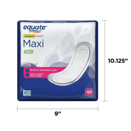 About This Item We aim to show you accurate product information. Manufacturers, suppliers and others provide what you see here, and we have not verified it. See our disclaimer Stay comfortable all day with these Equate Maxi Pads. They make it easier for you to get through heavy flow days. The absorbent core helps lock away liquid while the Omni-OdorGuard controls odors. Each one is individually wrapped for your convenience. These super-absorbent pads come in a handy 48-count pack. Making the right health decisions can be challenging. With a complete range of products and simple solutions, Equate allows you to take care of your family with confidence. Equate Super Multi-Channel Maxi Pads, 48-Count: Maxi pads feature cotton-soft cover for extra comfort and protection Absorbent core helps manage flow better Easy to use, simple to remove Designed for heavy-flow days to keep you dry and confident Over 1" longer than our regular multi-channel maxi Profiled shape helps to make the fit secure and comfortable Adhesive prevents shifting Omni-OdorGuard