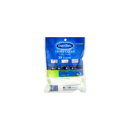About This Item We aim to show you accurate product information. Manufacturers, suppliers and others provide what you see here, and we have not verified it. See our disclaimer DenTek Floss Picks. Extra strong scrubbing floss. Removes plaque and food. Fights bad breath. Brush the spaces a toothbrush can't. Mouthwash blast with fluoride. DenTek Floss Picks. Extra strong scrubbing floss. Removes plaque and food. Fights bad breath. Brush the spaces a toothbrush can't. Mouthwash blast with fluoride. DenTek Triple Clean Floss Picks. Value size 150 ct. Mouthwash blast with fluoride. No break guaranteed*. Triple clean. Fits tight teeth. 3X clean. Removes plaque. Removes food. Fights bad breath. 150 floss picks.