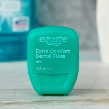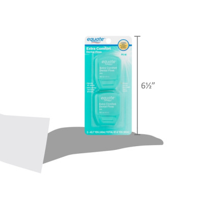 Dual pack of Equate Extra Comfort Mint Dental Floss is great. Always have a spare. Each package has 43.7 yds. This product slides between teeth easily and has a minty taste. The name is exactly that, extra comfort dental floss, gentle on the gums, removes plaque. Very easy to use and has a spare for another bathroom or keep near a work station. The lid snaps closed. Totally suggest to always have 2 handy.