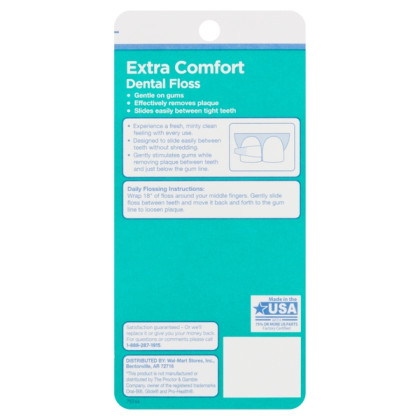 About This Item We aim to show you accurate product information. Manufacturers, suppliers and others provide what you see here, and we have not verified it. See our disclaimer The Equate Extra Comfort Mint Dental Floss is effective on plaque, yet thankfully very easy on your gums! Leaving you with a fresher, cleaner feeling after every single use, this mint dental floss compares to Oral-B Pro Health Comfort plus Floss and is designed for maximum comfort on both your fingers during use, as well as for between your teeth and around your gums. Each order of this floss includes two, 40m packages (80m in total). Making the right health decisions can be challenging. With a complete range of products and simple solutions, Equate allows you to take care of your family's needs with confidence. Compares to the Oral-B Pro-Health Comfort Plus Floss Dental floss that leaves you with a fresh, minty-clean feeling every time As equally effective on plaque and as it is easy on your gums Slides very easily between tight teeth Each order includes 40m each (a total of 80m) Instructions: Light flossing daily stimulates gums and helps to remove plaque buildup Ideal as part of a mindful oral hygiene routine *Oral-B, Glide and Pro-Health are registred trademarks of The Procter & Gamble Company.