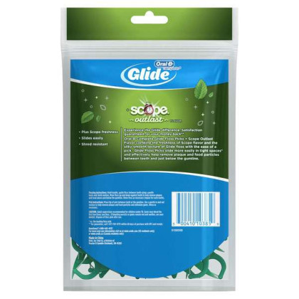 About This Item We aim to show you accurate product information. Manufacturers, suppliers and others provide what you see here, and we have not verified it. See our disclaimer Oral-B Complete Glide Floss Picks + Scope Outlast Flavor combine the freshness of Scope flavor and the silky-smooth texture of Glide floss with the ease of a pick. Glide Floss Picks slide more easily in tight spaces* and effectively help remove plaque and food particles between teeth and just below the gumline. Satisfaction Guaranteed, or your money back. For guarantee, call 1-877-769-8791 within 60 days of purchase with UPC and receipt. *vs. the leading floss pick Oral-B Glide Complete with Scope Outlast Dental Floss Picks, Mint, 150 Count: Slides up to 50% more easily in tight spaces* with the power of Oral-B Glide + the freshness of Scope Outlast flavor in the convenience of a floss pick. *vs. the leading floss picks Makes flossing simple: No mess, no fuss Contains the freshness of Scope Outlast flavor Effectively help remove plaque and food particles between teeth and just below the gumline Shred resistant floss with a textured, flexible pick end #1 Dentist Recommended Brand
