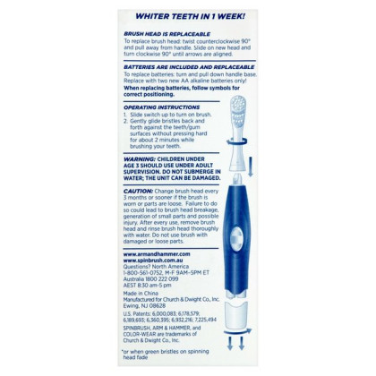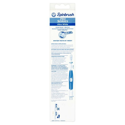 About This Item We aim to show you accurate product information. Manufacturers, suppliers and others provide what you see here, and we have not verified it. See our disclaimer Ultra White Soft Powered Toothbrush Color-Wear™ Bristles Remind you to change your brush head every 3 months* *or when green bristles on spinning head fade Dwight Co., Inc.*Or when green bristles on spinning head fade. Hammer Spinbrush Pro Series Ultra White Soft. Whiter teeth in 1 Week. With specialty whitening cup. Color-Wear bristles. Remind you to change your brush head every 3 months*. www.armandhammer.com . Questions? North America 1-800-561-0752, M-F 9AM-5PM ET. Spinbrush, Arm & Hammer, and color-wear are trademarks of Church & Hammer Spinbrush Pro Series Ultra White Soft. Dual action. The standard of purity. Arm & Arm &