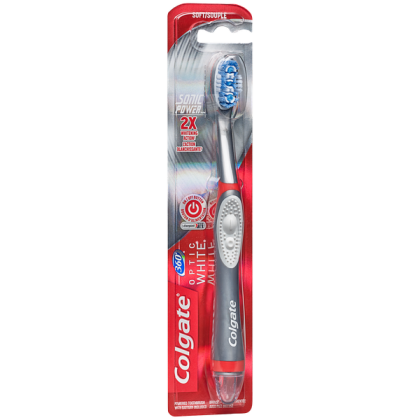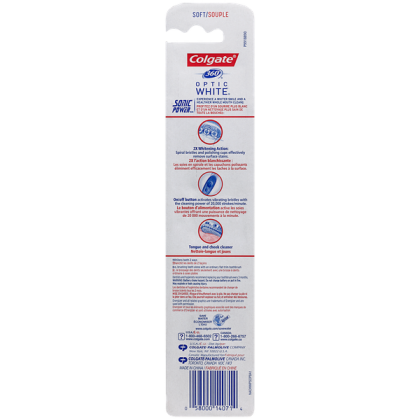 About This Item We aim to show you accurate product information. Manufacturers, suppliers and others provide what you see here, and we have not verified it. See our disclaimer Experience a whiter smile and a healthier whole mouth clean with the new Colgate 360â° Optic White Sonic Power toothbrush. The Colgate 360â° Degree Optic White Sonic Power toothbrush combines 20,000 strokes per minute with spiral bristles and polishing cups to help remove dental plaque and surface stains. This powered toothbrush includes a tongue & cheek cleaner to remove bacteria for a whiter, healthier whole mouth clean. Battery is included. Removes bacteria (Overall bacteria vs. brushing teeth alone with a flat trim toothbrush) with 20,000 strokes per minute provide superior cleaning for a healthier mouth; bristles and wraparound cheek & tongue cleaner remove more bacteria; Easy on/off button; Surround bristles simultaneously clean both sides of the teeth, and reach down to the gum line.