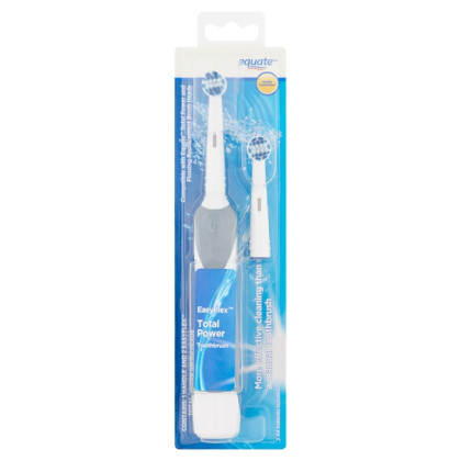 About This Item We aim to show you accurate product information. Manufacturers, suppliers and others provide what you see here, and we have not verified it. See our disclaimer The Equate EasyFlex Total Power Toothbrush is sure to simplify your oral hygiene routine! This automatic, Total Power Toothbrush goes deep into hard-to-reach areas with its multi-level, convenient, Replace-Me bristle design. It is powered by two AA batteries, which come included. This order also includes two toothbrush replacement heads. Making the right health decisions can be challenging. With a complete range of products and simple solutions, Equate allows you to take care of your family's needs with confidence. Equate EasyFlex Total Power Toothbrush: Automatic toothbrush cleans hard-to-reach areas and wipes away years of debris, plaque, and more Also compatible with other Equate Total Power accessories Powered by two AA batteries, which come included Features multi-level Replace-Me bristles which indicate times for optimal replacement Also includes two replacement toothbrush heads Compatible with Equate Total Power accessories and designed for truly gentle, complete cleaning Ideal as part of a mindful oral hygiene routine