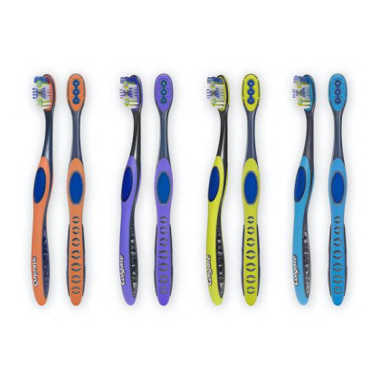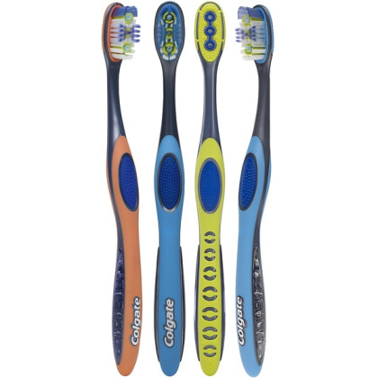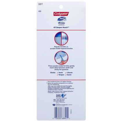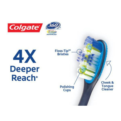 About This Item We aim to show you accurate product information. Manufacturers, suppliers and others provide what you see here, and we have not verified it. See our disclaimer The Colgate 360⁰ Total Advanced Soft Floss-Tip Bristles manual toothbrush is designed with tapered bristles that are 17 times thinner than ordinary end-rounded bristles. The purple-ended tapered bristles gently reach deep between teeth and along the gumline for a 4X deeper reach, compared to an ordinary flat trim toothbrush. The toothbrush’s unique cheek & tongue cleaner helps the brush remove odor-causing bacteria better than brushing teeth alone with an ordinary flat-trim toothbrush. The raised tip helps to gently clean hard-to-reach areas of the mouth. This toothbrush does not replace flossing. Colgate 360 Total Advanced Floss-Tip Toothbrush Value Pack, Soft, 4-Count: Floss-tip bristles for 4X deeper reach below the gum line compared to an ordinary flat-trim toothbrush Cleans teeth, tongue, cheeks and gums Purple-ended Floss-Tip bristles gently reach deep between teeth and along the gumline Ergonomic handle design This manual soft toothbrush does not replace flossing Tapered bristles are 17 times thinner than ordinary end-rounded bristles Cleans teeth and gums efficiently for a healthier whole-mouth clean Polishing cups hold toothpaste as you brush Raised tip also helps to clean hard-to-reach areas of the mouth Available with soft or medium bristles and in 4 vibrant handle colors 4-count floss-tip toothbrush value pack