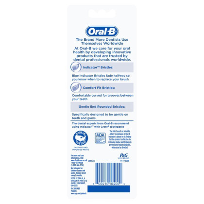 About This Item We aim to show you accurate product information. Manufacturers, suppliers and others provide what you see here, and we have not verified it. See our disclaimer The Oral-B Indicator Contour Clean Manual Toothbrush has bristles that fade halfway so you know when to replace your brush. Manual toothbrushes remove plaque and food from teeth to prevent decay. Oral-B Indicator Color Collection Manual Toothbrush, Soft, 4 Count: Blue Indicator Bristles fade halfway so you know when to replace your brush Comfort Fit Bristles are curved for grooves between your teeth Gentle End Rounded Bristles are specifically designed to be gentle on teeth and gums Oral-B, the brand more dentists use themselves worldwide
