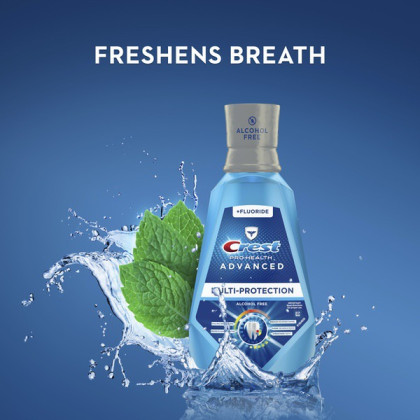About This Item We aim to show you accurate product information. Manufacturers, suppliers and others provide what you see here, and we have not verified it. See our disclaimer Crest Pro-Health Advanced Multi-Protection Mouthwash with Fluoride helps you have stronger teeth* for a healthier mouth. It kills bad breath germs, helps prevent cavities, strengthens enamel, cleans teeth and gums, and freshens breath. *when added to a good oral care routine by strengthening enamel Crest Pro-Health Advanced Mouthwash, Alcohol Free, Multi-Protection, Fresh Mint, 1 L (33.8 fl oz), Pack of 2: Helps prevent cavities Kills bad breath germs Strengthens enamel Cleans teeth and gums Alcohol free so there is no burn of alcohol Fresh mint flavor freshens breath