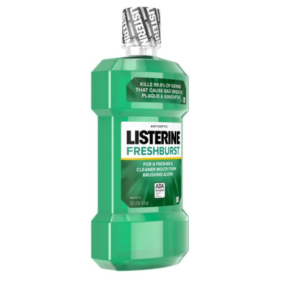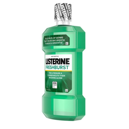 About This Item We aim to show you accurate product information. Manufacturers, suppliers and others provide what you see here, and we have not verified it. See our disclaimer Protect your mouth from germs and get fresh breath with Listerine Freshburst Antiseptic Mouthwash. It kills 99.9% of germs that cause bad breath, plaque, and gingivitis for a fresher and cleaner mouth than brushing alone. Clinically shown to reduce 52 percent more plaque and 21 percent more gingivitis than brushing and flossing alone, this antiseptic mouthwash provides a deep clean that cares for your whole mouth. Listerine Freshburst Mouthwash is a recipient of the ADA Seal of Acceptance for fighting plaque and gingivitis. The great-tasting Freshburst spearmint flavor of this antiseptic mouthwash leaves your mouth feeling clean and fresh. With approximately 25 days in this 1-L bottle, achieve maximum results by rinsing with this refreshing mouthwash for 30 seconds twice a day, both morning and night, for 24-hour germ protection. 1-l of Listerine Freshburst Antiseptic Mouthwash for bad breath, plaque & gingivitis Oral care formula kills 99.9% of germs that cause bad breath, plaque and gingivitis The spearmint flavor of this antiseptic mouthwash leaves your mouth feeling clean and refreshed With approximately 25 days, this 1-l bottle provides continuous, effective oral care Antiseptic mouthwash with refreshing spearmint flavor offers 24-hour protection against germs* Clinically shown to reduce more plaque and gingivitis than brushing and flossing alone Germ-killing mouthwash from the #1 dentist recommended brand of over the counter mouthwashes Rinse with mouthwash for 30 seconds twice a day to achieve maximum results and for fresh breath *With twice daily use.