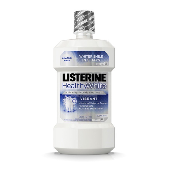 About This Item We aim to show you accurate product information. Manufacturers, suppliers and others provide what you see here, and we have not verified it. See our disclaimer Listerine Healthy White Vibrant Multi-Action mouth rinse is a mouthwash with extra teeth whitening power that starts to work on contact for a brighter smile in 5 days*. This mouth rinse with fluoride helps prevent cavities. Its dynamic foaming action works to effectively whiten teeth, even in hard-to-reach places. Designed to be used as part of a regular oral care routine twice each day, the refreshing clean mint mouthwash also kills the germs that cause bad breath.*Individual results may vary. 32-fl. oz Listerine Healthy White Vibrant Multi-Action Fluoride Mouthwash for teeth whitening Starts to whiten on contact for whiter teeth in 5 days* Anticavity fluoride mouthwash helps prevents cavities Kills the germs that cause bad breath to clean your whole mouth and freshen breath Enamel-safe formula effectively whitens teeth without damaging enamel Dynamic foaming mouthwash whitens in hard-to-reach places Made with a clean mint flavor to refresh your mouth after use Use twice daily as part of a regular oral care routine for best results *Individual results may vary.