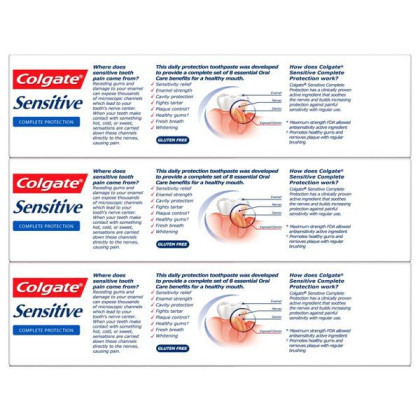 About This Item We aim to show you accurate product information. Manufacturers, suppliers and others provide what you see here, and we have not verified it. See our disclaimer Colgate Sensitive Complete Protection toothpaste provides 24/7 sensitivity protection with twice-daily brushing and was developed to help protect against cavities, strengthen enamel, whiten teeth, freshen breath, promote healthy gums and remove plaque with regular brushing. Colgate Sensitive Complete Protection toothpaste provides 24/7 sensitivity protection with twice-daily brushing and was developed to help protect against cavities, fight tartar and remove plaque with regular brushing. This sensitive toothpaste contains potassium nitrate, clinically proven to soothe the nerves in exposed dentin. With regular use, it provides long-lasting sensitivity relief. Plus Colgate Sensitive Complete Protection toothpaste is formulated to help strengthen enamel, whiten teeth, freshen breath and promote healthy gums with regular brushing. Clinically proven sensitivity relief Sensitive teeth toothpaste that provides 24/7 sensitivity protection (with twice-daily brushing) Maximum strength FDA-allowed antisensitivity active ingredient Fights tartar and removes plaque (with regular brushing) Helps protect teeth against cavities and promotes healthy gums (with regular brushing)