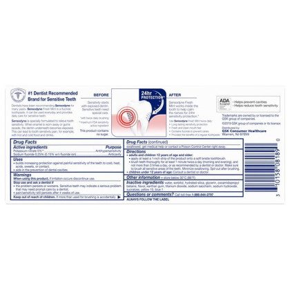 About This Item We aim to show you accurate product information. Manufacturers, suppliers and others provide what you see here, and we have not verified it. See our disclaimer Sensodyne Fresh Mint toothpaste for tooth sensitivity works deep inside the tooth to soothe painful sensitivity and helps keep the pain from coming back. Plus, it provides a mild mint flavor that keeps your mouth feeling fresh and clean. Sensodyne cavity protection toothpaste protects teeth against cavities with 24/7 sensitivity protection.* *With twice daily brushing Sensodyne Fresh Mint toothpaste for sensitive teeth relieves tooth pain caused by sensitive teeth Promotes lasting tooth sensitivity protection and protects teeth against cavities (with twice daily brushing) Sensodyne Fresh Mint sensitive toothpaste offers a mint flavor that helps keep breath fresh Sensodyne sensitive toothpaste is the number 1 dentist recommended toothpaste brand for sensitive teeth Best results with twice daily brushing